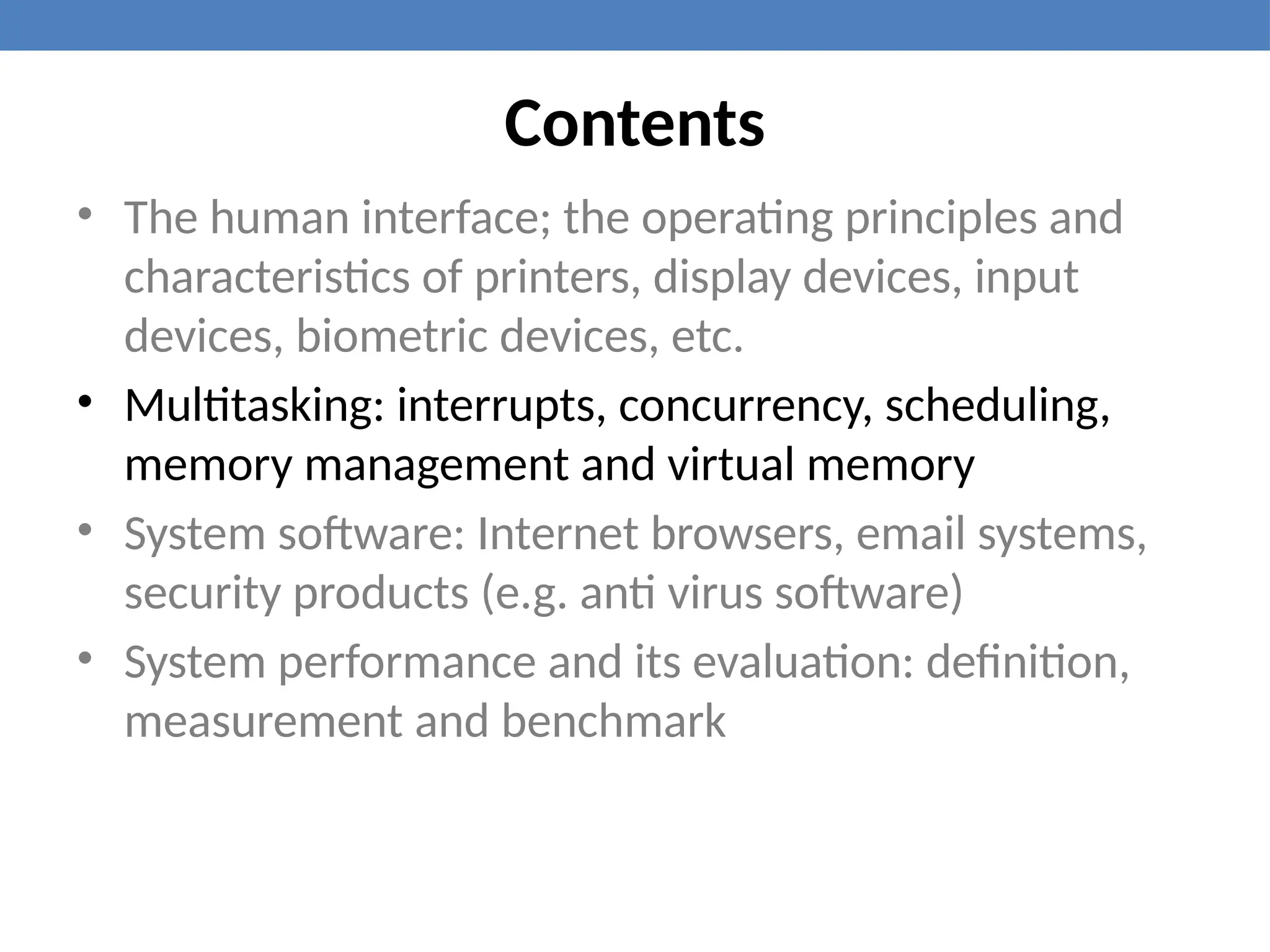 This document covers various aspects of operating systems and system software including multitasking, context switching, scheduling, concurrency, and memory management. Key concepts include the role of the kernel in managing multiple processes, the importance of context switching for process execution, and techniques for memory allocation and fragmentation. Additionally, it explains how operating systems evaluate performance and manage resources effectively.