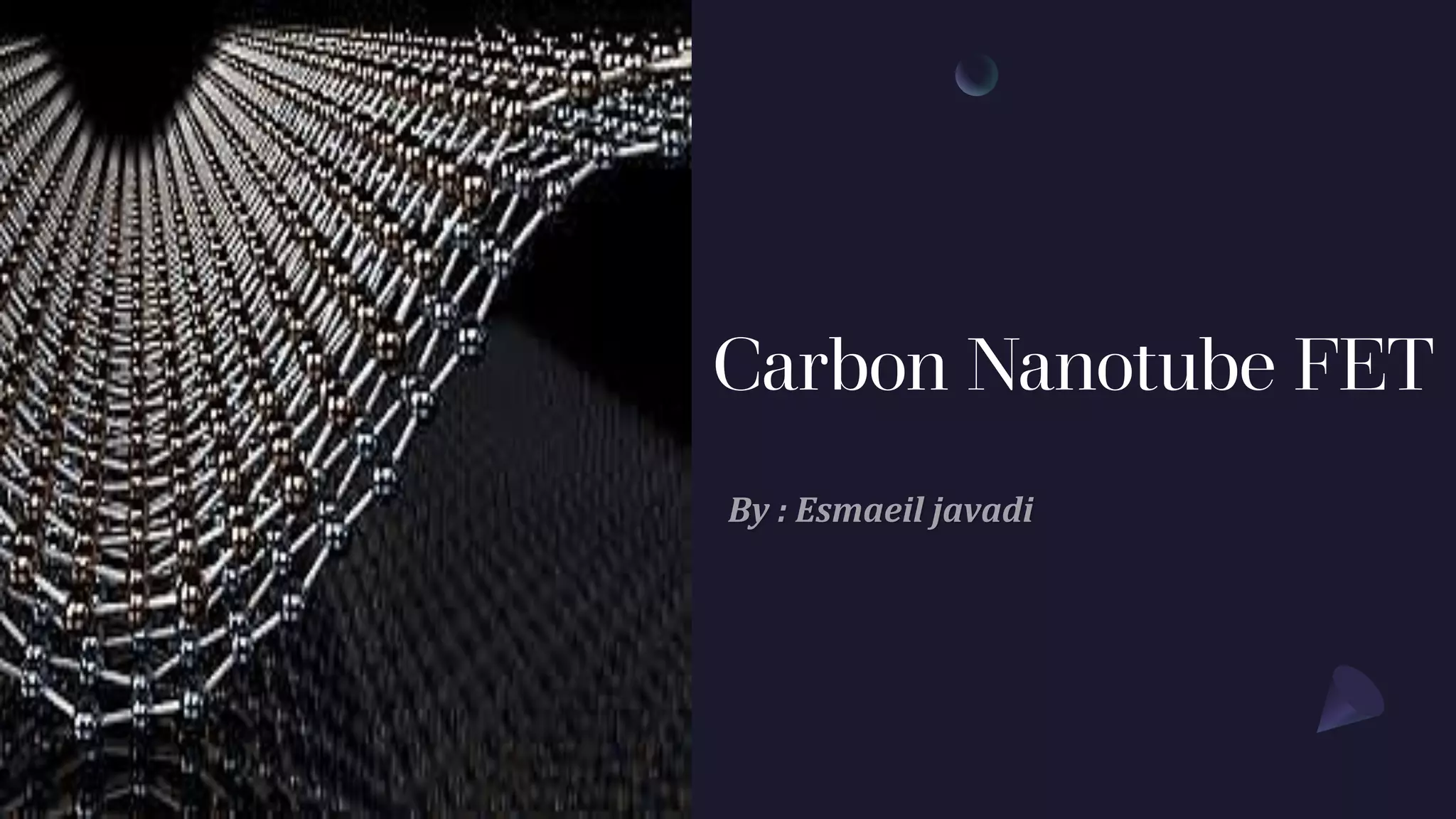 Carbon nanotube field-effect transistors (CNTFETs) are a promising candidate to replace conventional silicon transistors. CNTFETs use a carbon nanotube as the channel between the source and drain, controlled by a gate. They offer advantages like higher carrier mobility, lower power consumption, and the potential for terahertz switching speeds. However, CNTFET technology is still developing, with challenges including process variation and degradation over time when exposed to oxygen. Improving electrostatic control of the carbon nanotube channel through techniques like inner gate designs could help address these issues and bring CNTFETs closer to commercialization.