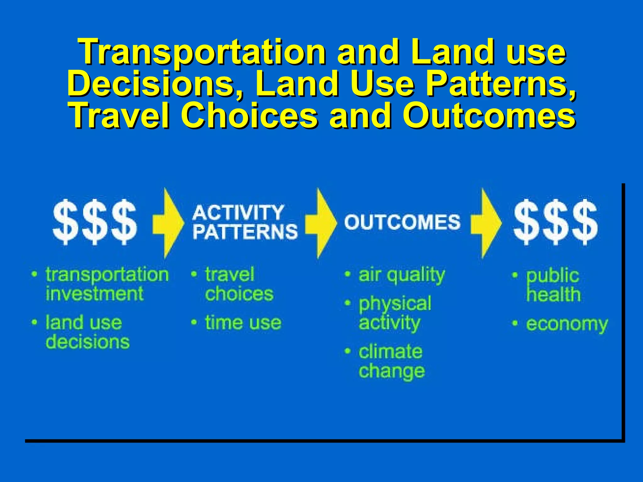 The document discusses the relationship between transportation network design, land use, and public health, emphasizing how built environments can influence health outcomes, travel choices, and greenhouse gas emissions. It presents research findings showing that increased street connectivity and mixed land use lead to greater walking and transit use, thereby reducing vehicle miles traveled and improving air quality. Additionally, it highlights the need for integrated policies that connect health, transportation, and environmental sectors to enhance community design for better health outcomes.