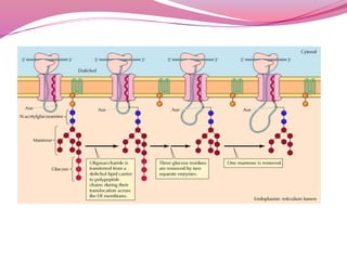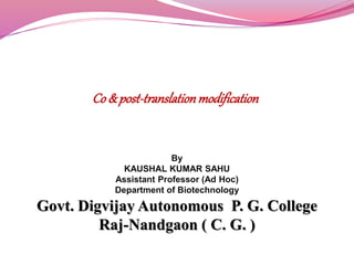 The document discusses protein modifications post-translation, emphasizing their role in protein folding, stability, and localization within cells. Key processes include chaperone-mediated folding, proteolysis, glycosylation, and lipid attachment, all of which are crucial for producing functional proteins from polypeptide chains. Additionally, it highlights the importance of degradation pathways in regulating protein levels and the impact of modifications on protein activity and interactions.