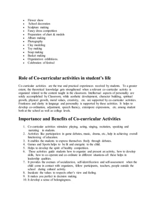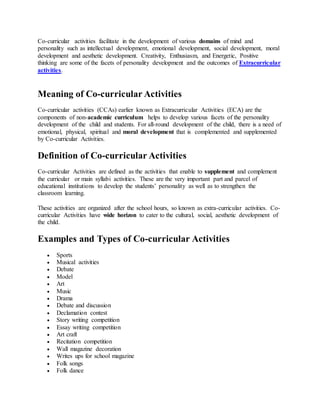 This document discusses co-curricular activities and their importance in a student's development. It begins by explaining that co-curricular activities facilitate intellectual, emotional, social, moral and aesthetic development. It then provides definitions of co-curricular activities and examples of different types of activities. The document emphasizes that co-curricular activities provide true, practical experiences for students and complement classroom learning. It outlines several benefits of co-curricular activities, including stimulating creativity and developing leadership skills. Finally, it discusses the role of teachers in organizing co-curricular activities and principles for doing so.