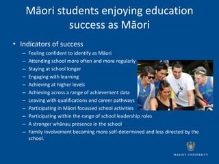 The document outlines indicators of success for Māori students enjoying education, including a case study on a Te Reo Māori class project that utilized ICT tools to motivate students and improve learning outcomes. It discusses establishing a culture of co-construction between teachers and students through sharing responsibility, creating common understandings, and reflecting together on classroom experiences. The document poses questions to consider implementing these ideas to develop thriving learning communities.
