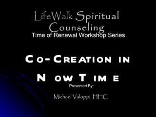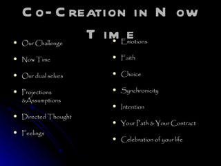 The document discusses concepts related to co-creation in the present moment. It explores how our dual physical and energetic selves interact, and how projections, assumptions, thoughts, feelings and emotions influence our experiences. Key aspects that allow for co-creation are discussed, including faith, intention, choice, synchronicity and understanding our life path and contracts. The overall message is that we can co-create positive experiences by being present in each moment and directing our thoughts, feelings and intentions in a conscious, purposeful way.