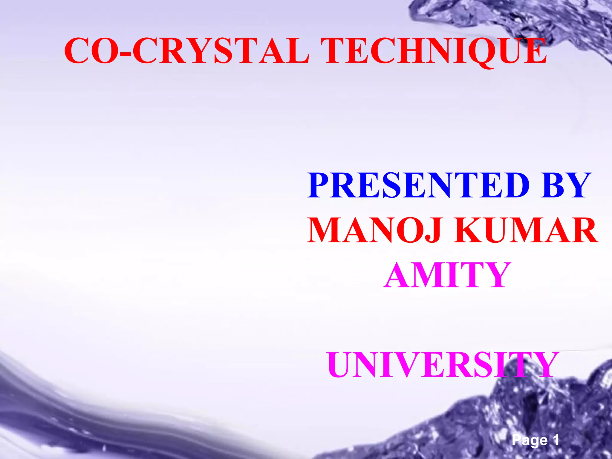 This document discusses the co-crystal technique for enhancing the solubility of poorly water soluble drugs. It introduces co-crystals as crystalline materials comprised of an active pharmaceutical ingredient and one or more co-crystal formers. Co-crystals can improve solubility and bioavailability through interactions like hydrogen bonding and pi-stacking. The document outlines various methods for preparing co-crystals, including solution methods, grinding, and supercritical fluid technology. It also discusses selecting appropriate co-formers, solvents, and evaluation methods like powder X-ray diffraction and solubility analysis. Several marketed drug products incorporating co-crystal technology are presented as examples.