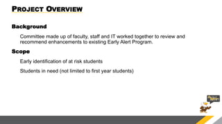 The Eagle Alert program is Houston Community College's early alert system to identify students struggling academically or personally. A committee reviewed the existing program and recommended keeping the current tool in PeopleSoft but developing training and standards. They formed a subcommittee to determine enhancements for faculty, advisors, and students. In spring 2016, over 5,000 alerts were issued across the colleges. The top reasons for alerts were poor class performance, missing classes, and personal issues. Most alerted students did not improve their grades or complete the semester successfully. The presentation outlines next steps like communicating data, providing training, and recognizing high performers.