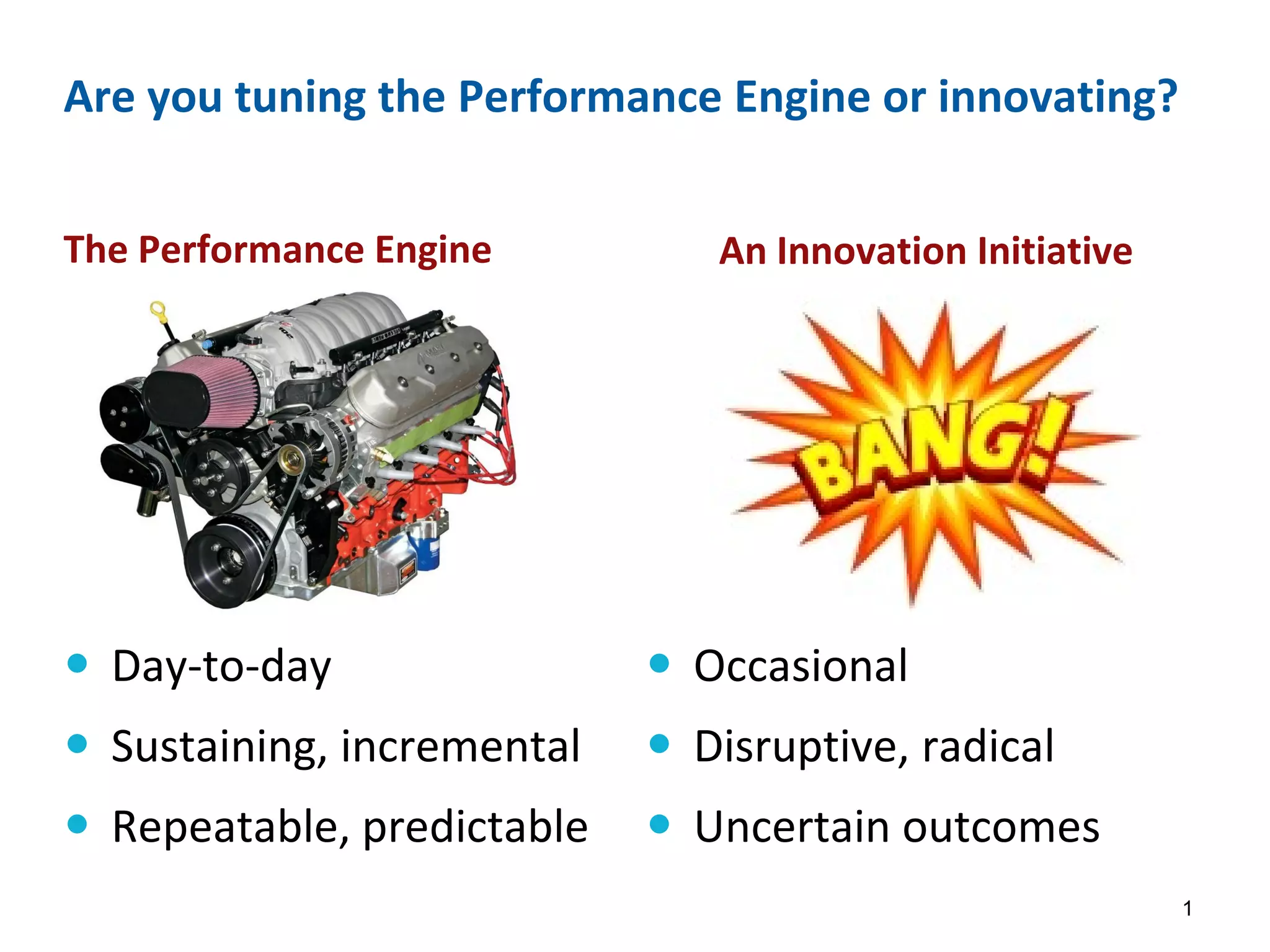 The document discusses the need for organizations to balance their performance engines with continuous innovation to remain competitive. It outlines different approaches to continuous innovation from companies like Amazon, Google, and 3M, highlighting their management systems and successful innovations. Lastly, it emphasizes the necessity of creating a strategic balance to address current operational demands while fostering future innovations.