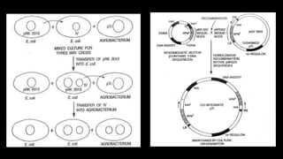 The document discusses co-integrated vectors, engineered TI plasmids used for Agrobacterium-mediated transformation in plants. It outlines three types of vectors: disarmed Agrobacterium TI plasmids without oncogenes, intermediate vectors for overcoming size limitations, and helper vectors that aid in gene transfer. However, the method faces drawbacks such as long homologies required for engineering and relatively inefficient gene transfer compared to binary vectors.