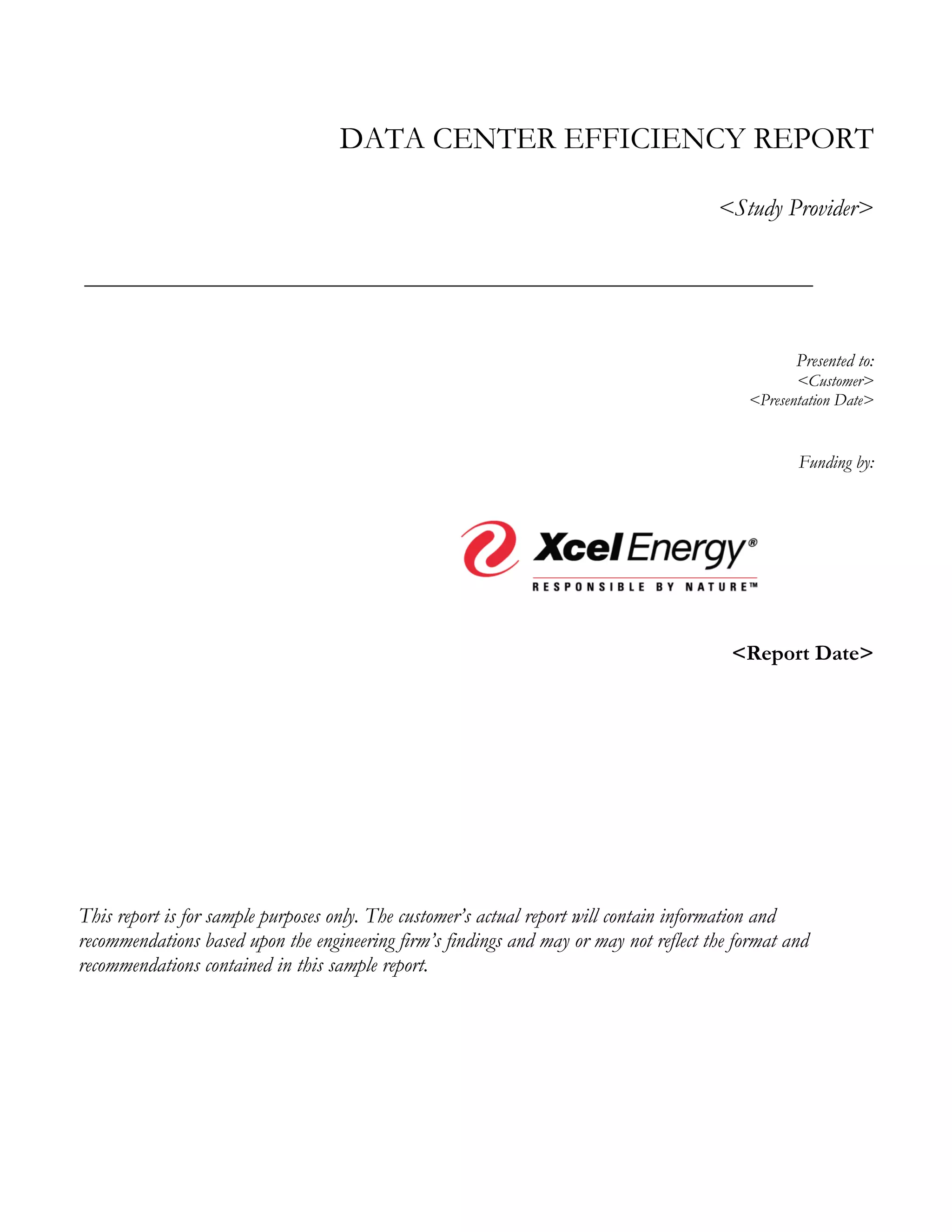 This data center efficiency report outlines a study aimed at assessing energy efficiency opportunities for a customer, providing a business case for implementing improvements. It includes recommendations for energy conservation measures (ECOs), with a focus on bundling projects to maximize rebate eligibility, and highlights key data related to the data center's operations. The report also emphasizes the importance of meeting Xcel Energy's requirements for pre-approval of custom efficiency projects.