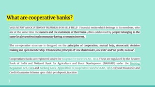 Cooperative banks are voluntary associations owned and operated by their members. They are established to provide self-help and mutual assistance to their members. In India, cooperative banks are registered under state cooperative societies acts and regulated by the Reserve Bank of India.