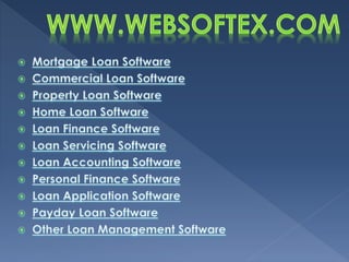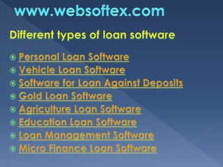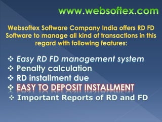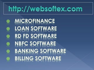 Websoftex Software Solutions is a Bangalore-based company that provides website design, development, and microfinance software. The company's microfinance software features include personal details, qualifications, contact information, emergency contacts, dependents, job information, salary information, employee reporting structure, memberships, training courses, and leave summaries. Websoftex offers loan software, co-operative software, accounting software, custom software, mortgage software, NBFC software, e-commerce software, and billing software. It is an experienced RD FD software company that provides web development and design solutions. Websoftex's banking software is a powerful online and windows-based application integrated with core banking systems to manage all aspects of business.
