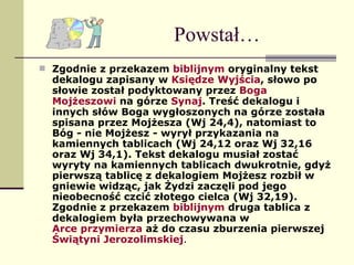 Powstał… Zgodniez przekazem biblijnym oryginalny tekst dekalogu zapisany w Księdze Wyjścia , słowo po słowie został podyktowany przez Boga Mojżeszowi na górze Synaj . Treść dekalogu i innych słów Boga wygłoszonych na górze została spisana przez Mojżesza (Wj 24,4), natomiast to Bóg - nie Mojżesz - wyrył przykazania na kamiennych tablicach (Wj 24,12 oraz Wj 32,16 oraz Wj 34,1). Tekst dekalogu musiał zostać wyryty na kamiennych tablicach dwukrotnie, gdyż pierwszą tablicę z dekalogiem Mojżesz rozbił w gniewie widząc, jak Żydzi zaczęli pod jego nieobecność czcić złotego cielca (Wj 32,19). Zgodnie z przekazem biblijnym druga tablica z dekalogiem była przechowywana w Arce przymierza aż do czasu zburzenia pierwszej Świątyni Jerozolimskiej .