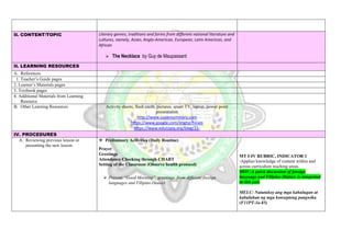 The document outlines a lesson plan for analyzing Guy de Maupassant's short story "The Necklace" using various literary approaches including structuralist, moralist, Marxist, feminist, and historical. The plan includes objectives, topics, resources, procedures such as motivation, activities, and discussion. The story will be analyzed based on elements, structure, artistic value, and cultural symbolism of jewelry.