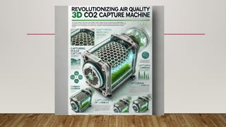 The document discusses the urgent need for CO2 capture technology to combat climate change, specifically focusing on a 3D carbon dioxide capture machine that efficiently removes CO2 from the atmosphere. This machine utilizes a honeycomb ceramic catalyst and potassium hydrogen carbonate to absorb and store CO2, thereby improving air quality and contributing to sustainable fuel production. It emphasizes the importance of public awareness and educational initiatives to support the adoption of carbon capture technologies.