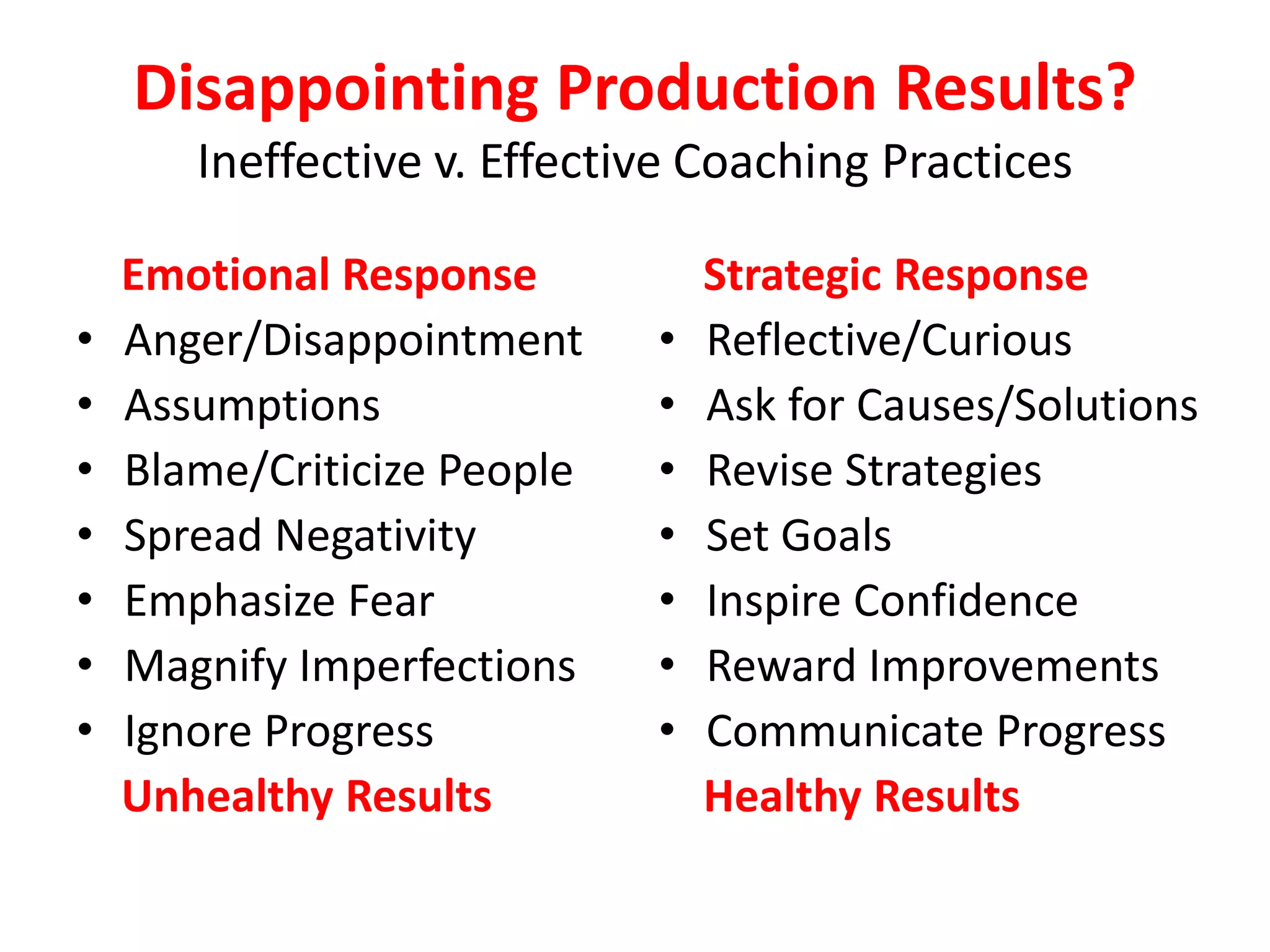This document discusses effective vs ineffective coaching practices and their results. An emotional response such as anger or blame leads to unhealthy results like negativity and focusing on imperfections. A strategic response involves being reflective, asking for causes and solutions, revising strategies, setting goals, inspiring confidence, and communicating progress, which leads to healthy results. It also discusses self-esteem variables and how factors like upbringing, education, relationships, and success impact self-esteem.
