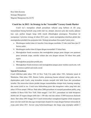 Coach Inc. adalah perusahaan barang mewah yang fokus pada memperluas distribusi global dan produktivitas penjualan dengan membuka toko baru dan meningkatkan brand awareness. Pada 2012, strategi perusahaan meliputi diferensiasi produk, penguatan jaringan distribusi, dan ekspansi pasar di Asia dan Eropa, sambil menghadapi ancaman kompetisi di pasar barang mewah. Coach juga mengandalkan outsourcing produksi dan inovasi berkelanjutan untuk menjaga biaya dan meningkatkan daya tarik pasar.