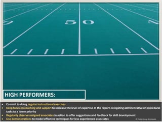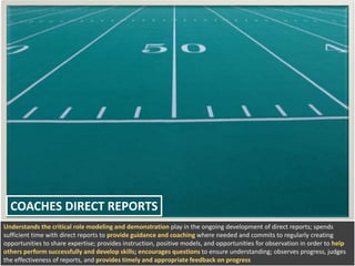 The document provides guidance for coaches on developing their direct reports through modeling, demonstration, instruction, and feedback. It recommends that coaches spend sufficient time with direct reports to provide guidance, commit to sharing expertise through opportunities for observation, and encourage questions to ensure understanding. Coaches should also regularly observe direct reports, judge their effectiveness, and provide timely feedback to help reports perform successfully and develop skills.