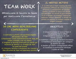 Il documento presenta un approccio strategico per potenziare le performance e l'innovazione del team attraverso cinque fasi del processo creativo. Viene sottolineata l'importanza delle competenze emotive, della comunicazione efficace e dell'allineamento agli obiettivi, integrando metodologie personalizzate di team coaching e team building. L'obiettivo finale è formare un team innovativo e collaborativo, capace di affrontare le sfide dell'innovazione con successo.
