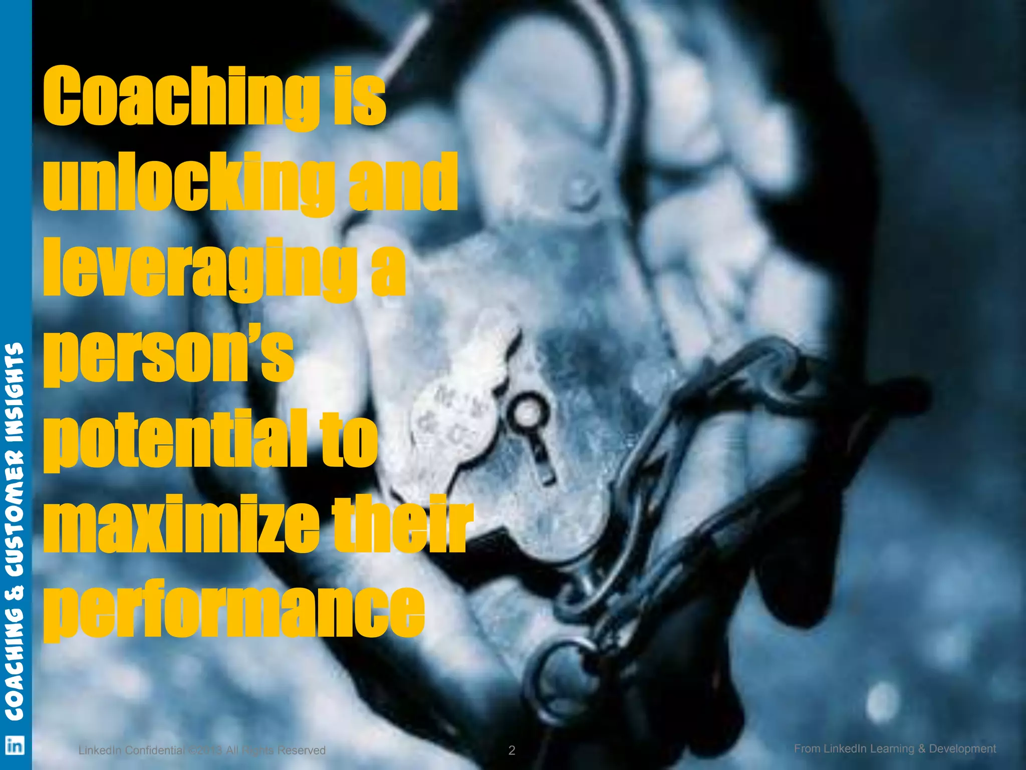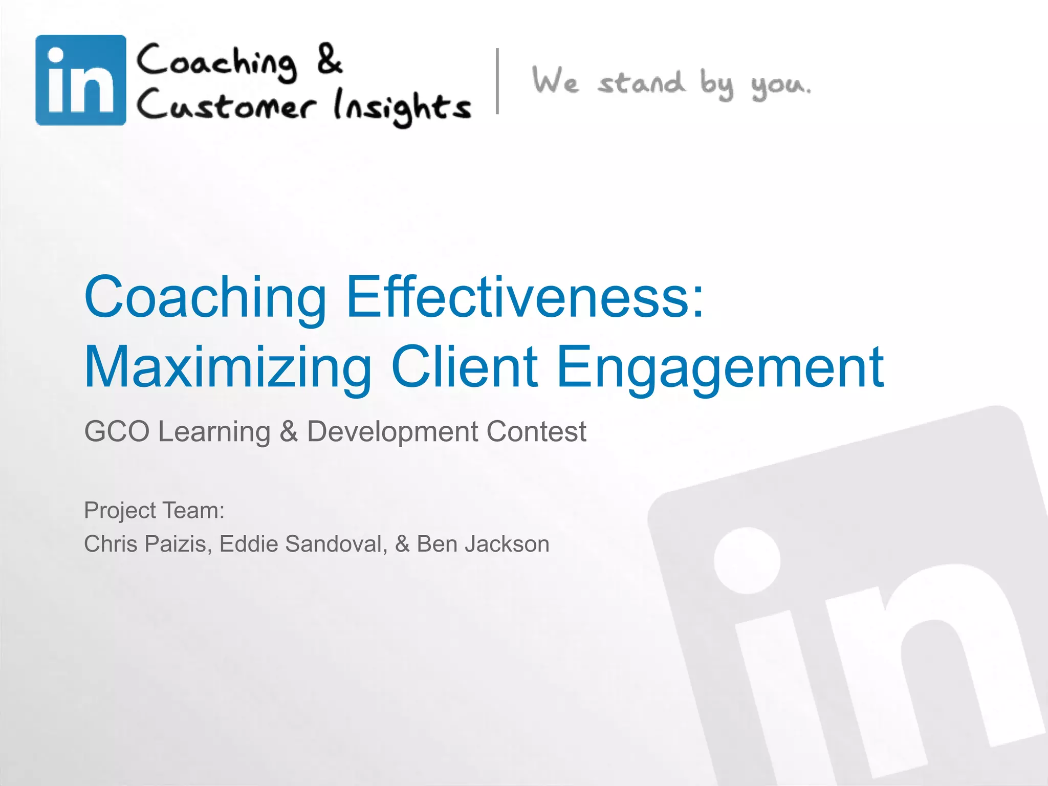 The document discusses a coaching effectiveness initiative aimed at maximizing client engagement through a structured framework that includes qualities of a coach, interactive conversation types, and essential tools. It highlights the implementation of a coaching model that enhances mutual understanding and engagement, leading to high participant ratings of session value and engagement. The next steps involve further training of coaches, supervisors, and mentors to foster a coaching culture.