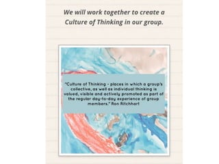 This document outlines an agenda for a workshop on coaching a culture of thinking. The workshop will include introductions, a discussion of coaching and cultures of thinking, an explanation of a protocol for structured small group discussions, and reflections. Participants will discuss what coaching and cultures of thinking are, how coaching can help create cultures of thinking, and how cultures of thinking can help coaching. The goal is to understand how coaching and a culture of thinking can support each other.