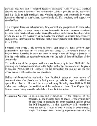 The document outlines a coaching program for teachers at Cogon High School Evening Class to develop 21st century skills and become proficient at integrating technology into their teaching. The program will involve peer coaching sessions where teachers work collaboratively on individualized professional development plans. It will run from January to June 2013 and involve online collaboration as well as in-person Saturday sessions. Progress will be monitored through project implementation, documentation of activities, and portfolio assessments to ensure all teachers fully learn the new skills and apply them in their classrooms.