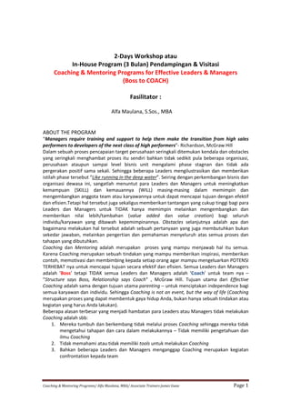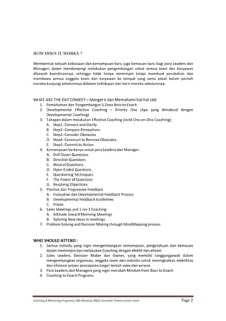 Dokumen ini membahas program coaching dan mentoring yang dirancang untuk meningkatkan kemampuan kepemimpinan dan pengembangan tim bagi para manajer dan pemimpin. Program ini bertujuan untuk mengatasi hambatan dalam mencapai target perusahaan dengan memberikan pemahaman dan praktik coaching yang efektif. Dengan berbagai pendekatan dan teknik, diharapkan para peserta dapat bertransformasi dari peran sebagai 'boss' menjadi 'coach' yang mampu menginspirasi dan mengembangkan tim mereka.