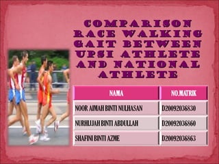 The document provides information about a study comparing the walking gait technique between UPSI athletes and national athletes. It aims to improve the walking gait technique of UPSI athletes and help them achieve their goals in walking gait races. Details are given about a UPSI athlete participant and a sample 6-week training plan is outlined. Techniques for different aspects of race walking are also described.