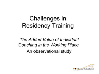 This observational study explores the efficacy of individual coaching in addressing challenges faced by residents during their training. Results indicate high satisfaction among participants, with reported improvements in job satisfaction and professional behavior. Key elements include structured coaching sessions, role-playing, and focused interventions on communication and collaboration skills.