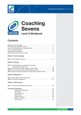 This document provides information about the International Rugby Board's Level 2 Coaching Sevens course, including: