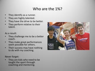 The document discusses coaching high school cross country runners, focusing on how to shape a team through building relationships and a team-first environment. It emphasizes building talented runners through varied training including tempo runs, long runs, and interval workouts while encouraging those who are less naturally gifted. The goal is to teach the sport through coaching and help all athletes identify as runners capable of success.