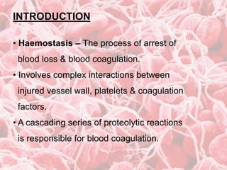 This document discusses coagulants and factors involved in the coagulation cascade. It describes 13 clotting factors and how deficiencies can cause bleeding disorders. Vitamin K is important for blood clotting as it allows for the carboxylation of factors II, VII, IX, and X. Other coagulants discussed include fibrinogen, antihemophilic factor, desmopressin, and local hemostatics that can control bleeding from specific sites.