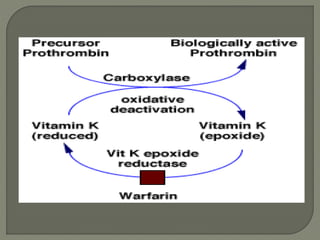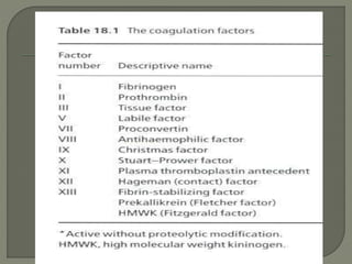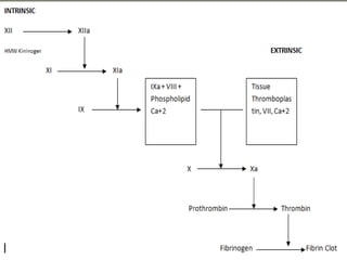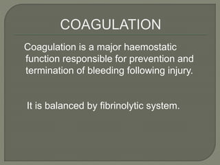 The document summarizes key aspects of blood coagulation and fibrinolysis. It describes the three steps of blood coagulation including the formation of prothrombin activator and its conversion to thrombin. It also discusses the intrinsic and extrinsic coagulation pathways. Common coagulation tests are outlined including their components and normal values. Various coagulation disorders like hemophilia and liver disease are described. Commonly used anticoagulant and antiplatelet drugs are explained in terms of their mechanisms and adverse effects.