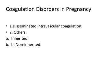 1. Disseminated intravascular coagulation (DIC) is a coagulation disorder that can occur during pregnancy as a result of placental abruption, amniotic fluid embolism, or other traumatic events.