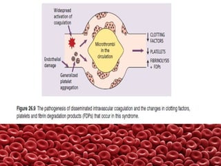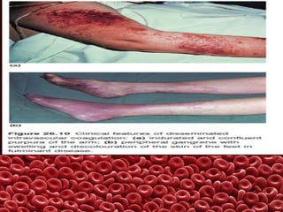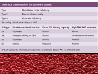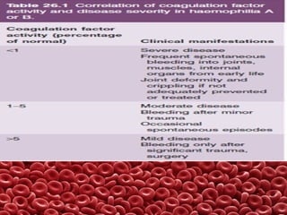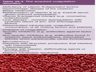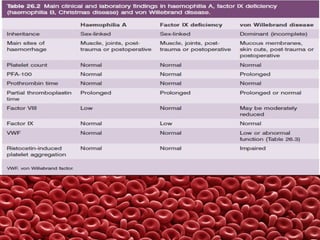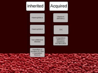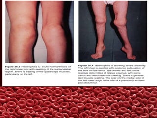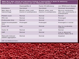 This document summarizes several coagulation disorders including haemophilia A, haemophilia B, von Willebrand disease, other hereditary coagulation factor deficiencies, and disseminated intravascular coagulation. It describes the clinical features, inheritance, laboratory findings, treatment, and management of each condition. Key points include that haemophilia A is the most common clotting factor deficiency, von Willebrand disease is the most common inherited bleeding disorder, and disseminated intravascular coagulation can be triggered by trauma, infection, cancer and other conditions.