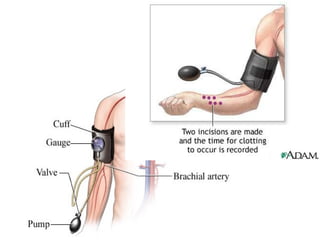 The bleeding time test measures the time it takes for a small puncture wound to stop bleeding. It evaluates platelet function and vascular integrity. The preferred method is the Surgicutt/Simplate method, which uses a spring-loaded device to make a standardized 1mm deep incision. The procedure involves inflating a blood pressure cuff to 40mmHg, making the incision, and blotting the wound every 30 seconds with filter paper to see when bleeding stops. The normal bleeding time range is 1-9 minutes. Sources of error include aspirin use, improper puncture technique, not timing correctly, or allowing the filter paper to touch the wound.