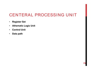 This document discusses various aspects of computer organization and assembly language. It covers the central processing unit including the register set, arithmetic logic unit, control unit, and data path. It also describes different instruction cycle models and bus organizations such as one-bus, two-bus, and three-bus. Interrupts and how they allow other modules to interrupt normal program processing are explained. The control unit and how it manages computer resources through control and timing signals is covered. Microprogrammed and hardwired control unit designs are compared.
