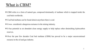 Coal bed methane (CBM) refers to natural gas trapped in coal beds. CBM was previously considered a mining hazard but is now seen as a potential energy source. Global CBM production has increased in recent decades in countries like the US, Australia, and China. India has significant estimated CBM reserves of around 70 trillion cubic feet. While CBM development has faced challenges in India, it could help meet the country's growing energy demand and reduce reliance on imports. Enhanced recovery techniques using carbon dioxide injection may further increase CBM production potential in the future.