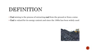 Coal mining involves extracting coal from the ground or mines. Coal is crushed, mixed with water and transported through pipelines. Coal processing further prepares the coal and can include crushing, screening, beneficiation to convert run-of-mine coal into a product that meets customer requirements, as coal is valued for its energy content and has been widely used since the 1880s for producing gas, supporting industrial aluminum production, assisting cement production, becoming a transportation fuel, and producing other minerals.