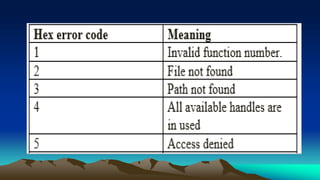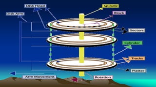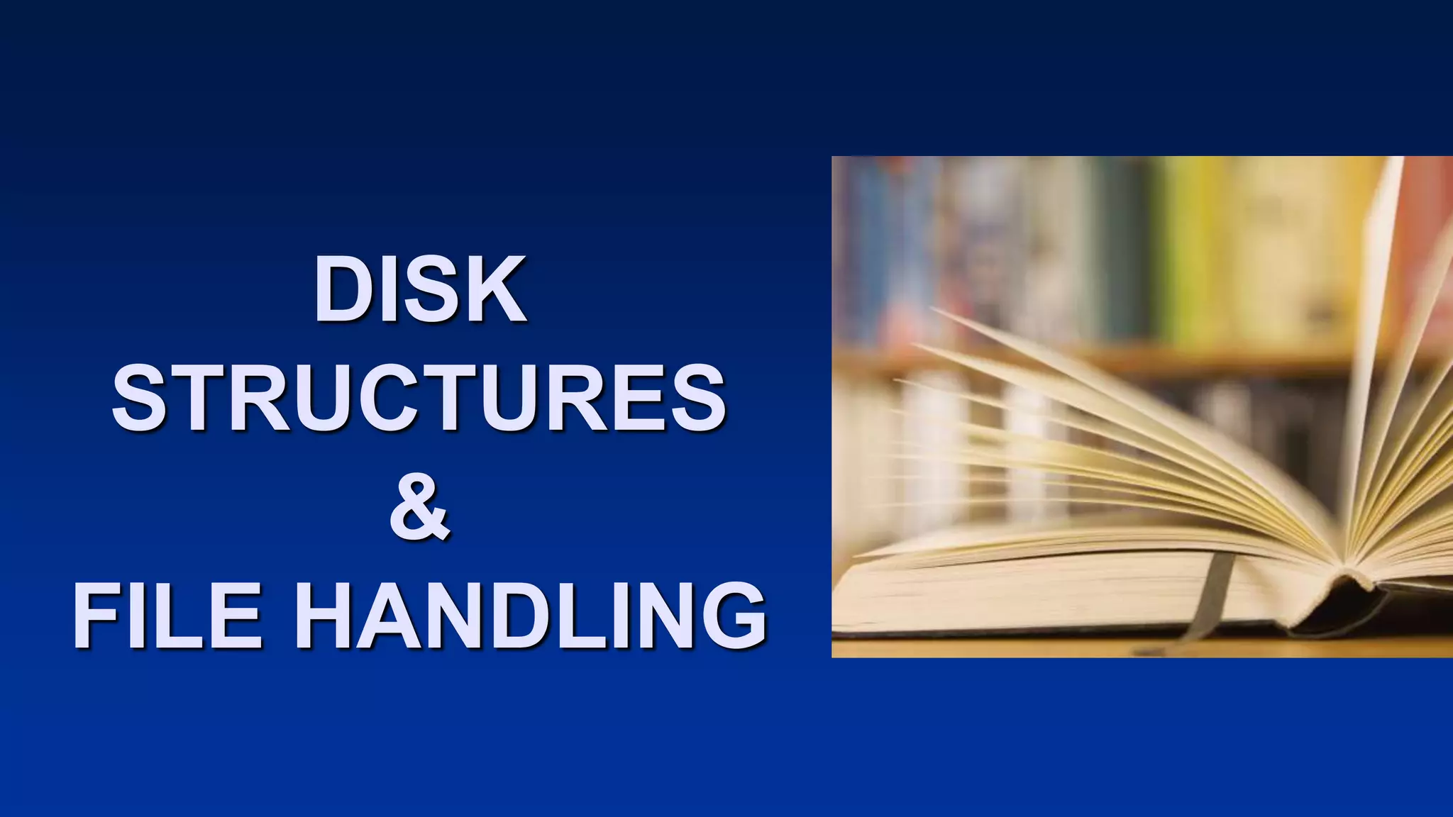 This document discusses disk structures and file handling. It covers floppy disks, hard disks, file allocation, how DOS reads and writes files using file handles, and basic file operations like create, write, read, delete and close. Disk structures include tracks, sectors, cylinders and partitions. File allocation uses a file allocation table to track file fragments across the disk.