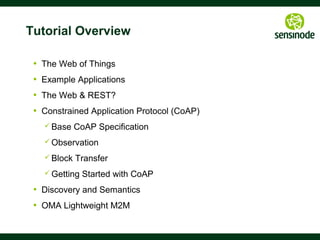 The document provides an overview of CoAP (Constrained Application Protocol), an open IETF standard designed for the Internet of Things (IoT) that supports efficient and secure communication for constrained devices. It covers the protocol's features, transaction model, caching mechanisms, and resource discovery techniques, as well as various open-source implementations. The document emphasizes CoAP's role in bridging web applications and IoT nodes while highlighting its limitations compared to HTTP.
