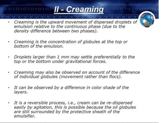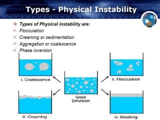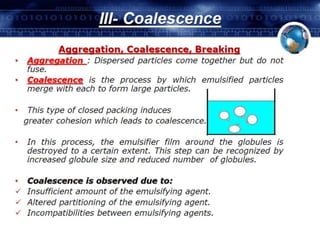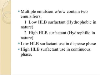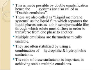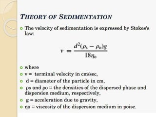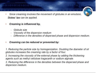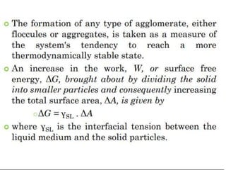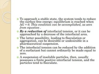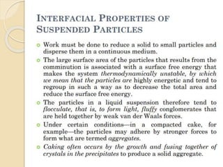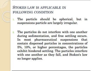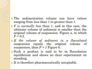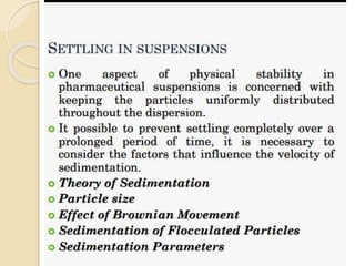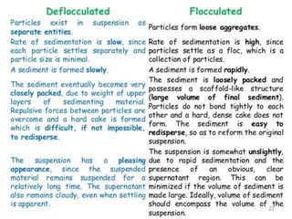 Coarse dispersions are heterogeneous systems where the dispersed particles are larger than 1000 nm. They are characterized by relatively fast sedimentation. The dispersed phase may be easily separated from the continuous phase by filtration. A pharmaceutical suspension is a coarse dispersion where the internal phase is uniformly dispersed throughout the external phase. The internal phase typically has particle sizes between 0.5-5 microns. Suspensions demonstrate properties like pseudoplasticity and thixotropy which influence stability during manufacture and storage.