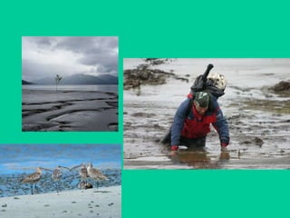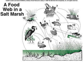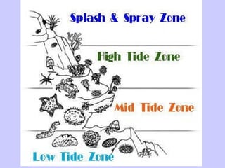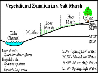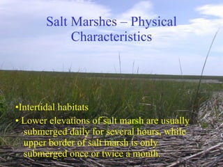Salt marsh communities are found in protected coastal areas dominated by salt-tolerant grasses. They provide important habitat for many species of fish, birds, and invertebrates. Salt marshes act as natural buffers against flooding and filter pollutants from water. However, they face threats from development, ditching, overharvesting, and other human impacts. Mud flats adjacent to salt marshes provide habitat for diverse invertebrate communities and feeding grounds for other species. Seagrass beds in shallow coastal waters create structured habitat and nurseries while improving water quality and moderating currents. However, they are threatened by boat damage, declining water quality from runoff, and rising sea levels. Rocky intertidal