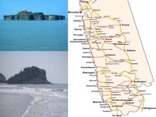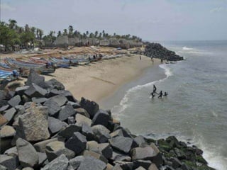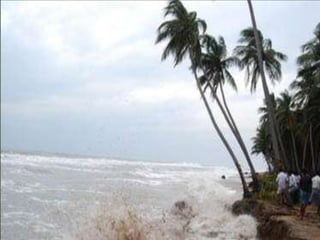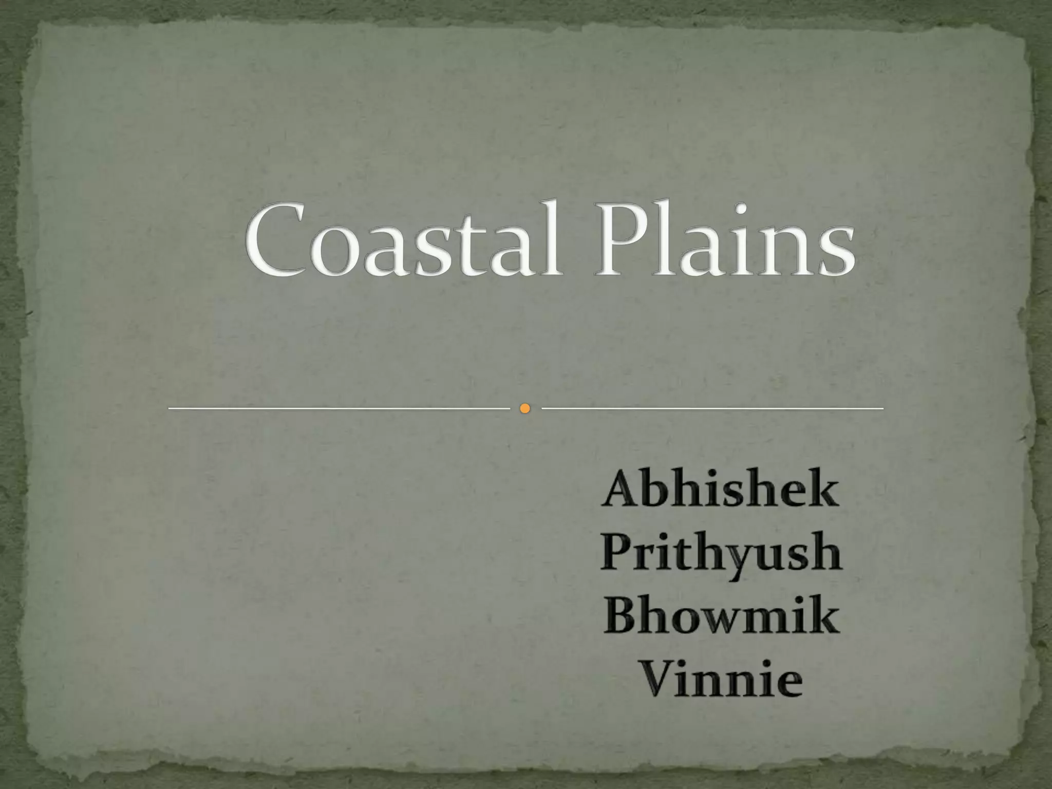 The document discusses the coastal plains found in India. It describes the key features of coastal plains, noting they are flat, low-lying areas adjacent to large bodies of water. It then provides details on the eastern and western coastal plains of India, describing their geographic locations, climate conditions, vegetation, and division into different regions. The eastern coastal plains stretch from Tamil Nadu to West Bengal along the Bay of Bengal, while the western coastal plains run between Gujarat and Kerala along the Arabian Sea. Both experiences tropical climates and receive significant rainfall from seasonal monsoons.