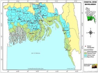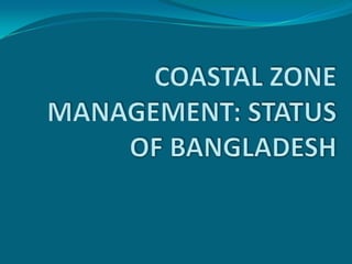 The document discusses coastal zone management in Bangladesh. It notes that Bangladesh has a complex coastline affected by natural hazards. Integrated coastal zone management (ICZM) is presented as a dynamic, multidisciplinary process to promote sustainable management. Key components of ICZM in Bangladesh include a coastal zone policy, coastal development strategy, and priority investment program. Challenges to management include implementation difficulties, poverty, pollution, and climate change impacts. Improved governance, policies, information sharing, and sustained political support are seen as important initiatives needed for effective coastal zone management.
