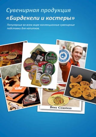 Документ подробно описывает сувенирные подставки для напитков, известные как бирдекели и костеры, их историю, использование и популярность в ресторанах и домах. Включает информацию о возможности их коллекционирования и продажах в музеях, а также предлагает ассортимент новинок для магазинов, включая наборы с изображениями известных произведений искусства. Подчеркивается важность бирдекелей в ресторанной культуре и их роль как высокомаржинального товара для удовлетворения потребительского спроса.