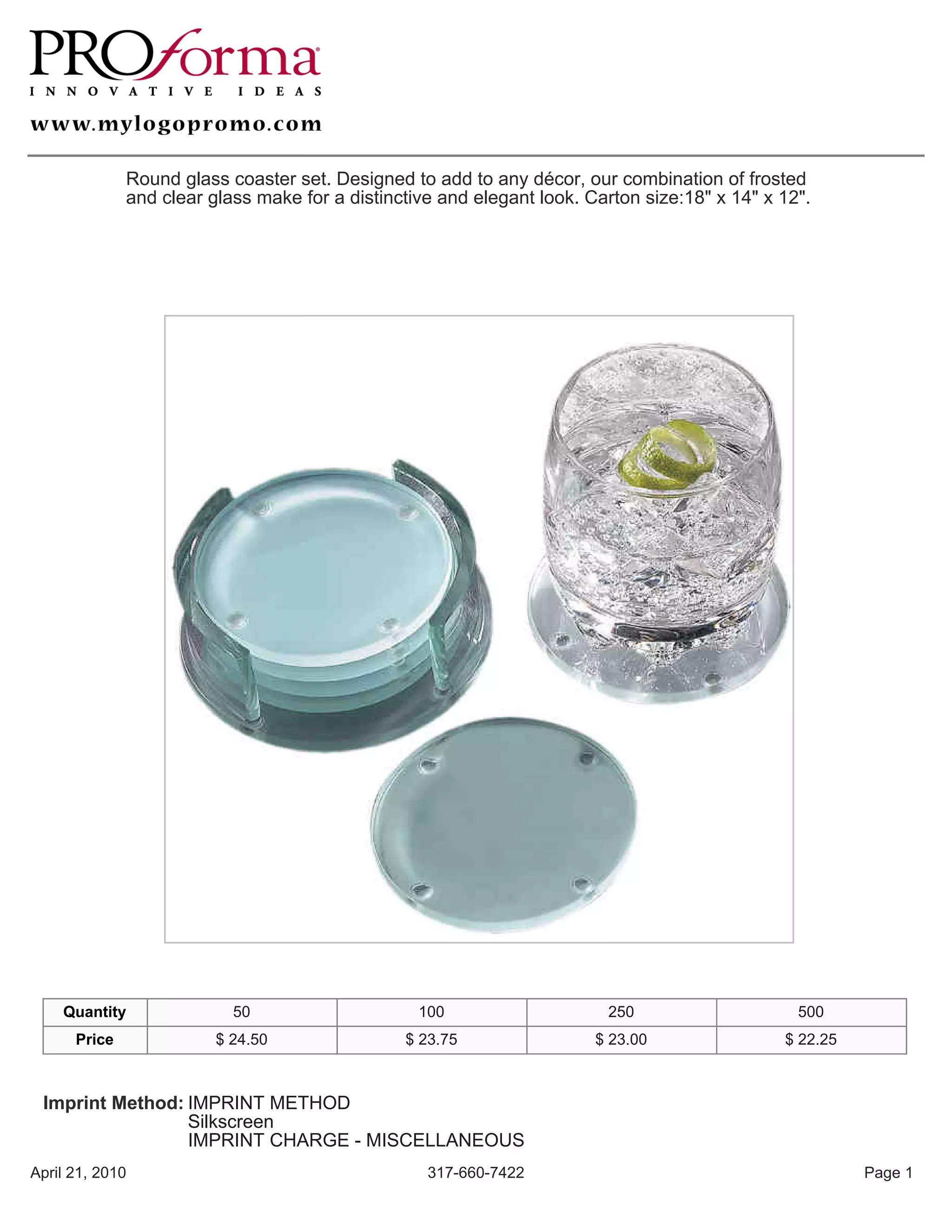 1. A round glass coaster set with frosted and clear glasses in a 18" x 14" x 12" carton.