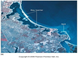 There are two main types of coasts: erosional and depositional. Erosional coasts experience removal of material from land attacks like erosion and sea attacks like storms. Depositional coasts experience addition of material, forming features like beaches, barrier islands, coral reefs, and wetlands. Coral reefs can be fringing, barrier, or atoll reefs depending on their location relative to land.