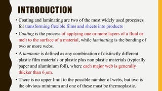 This document discusses coating and laminating processes for paper and films. It describes several methods including extrusion coating, thermal laminating, wet bond laminating, dry bonding, solventless laminating, and extrusion laminating. Extrusion coating is commonly used to apply polyethylene to paperboard with benefits over wax coating like greater strength and moisture resistance. Laminating combines webs using thermal or chemical bonding with adhesives. Thermal laminating uses heat to bond adhesives while wet bond laminating relies on water or solvent. Dry bonding and solventless laminating avoid volatile organic compounds. The document also discusses factors in dry surface treatment coating like particle size and heat treatment to achieve an adequate coating layer.