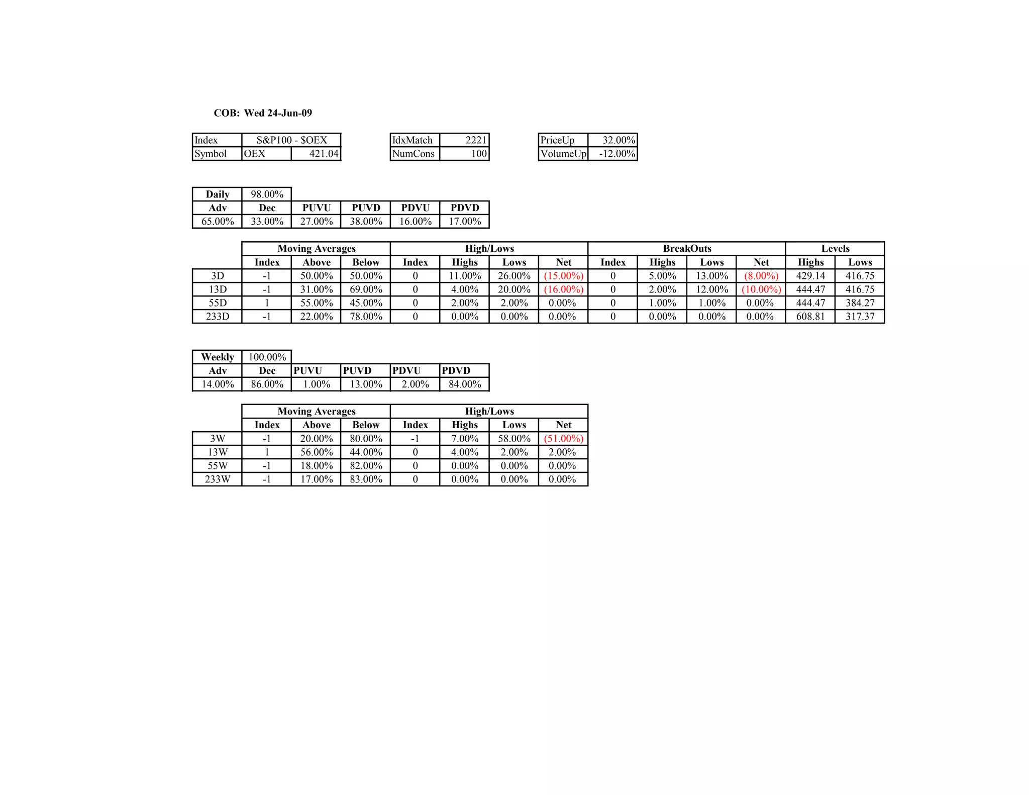 The document provides stock market index data from several US stock market indices as of June 24, 2009. It includes daily and weekly performance statistics as well as information on moving averages and highs/lows for indexes such as the S&P 100, Nasdaq 100, S&P 500, Russell 1000, Russell 2000, and Russell 3000. The indexes showed mixed performance over various periods with advances outweighing declines in most cases on a daily basis but declines dominating on a weekly basis according to the data.