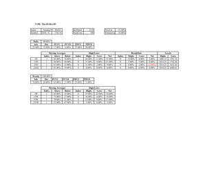 The document provides market index data for several US stock market indices as of Thursday, December 3, 2009. It includes daily and weekly statistics on price movement, trading volume, and percentages of stocks within each index that are above or below moving averages. The S&P 500 and other major indices saw price declines of around 60% compared to the prior day/week, with most individual stocks also lower. Trading volume was up modestly for most indices.