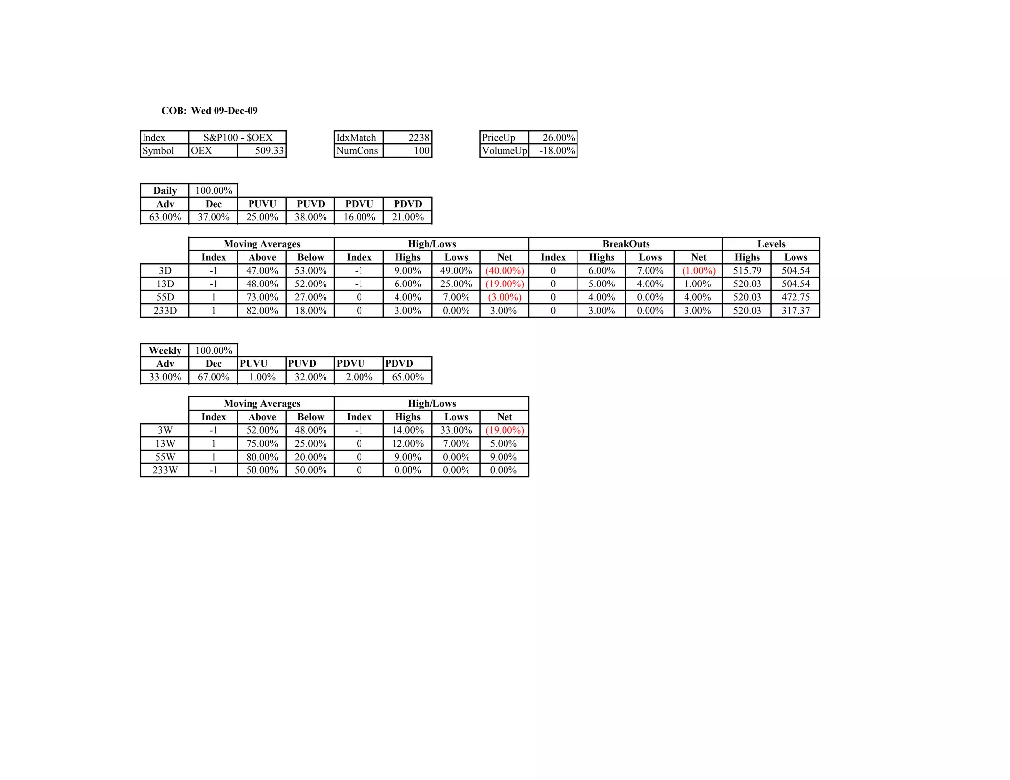 The document provides market index data from several US stock market indices as of Wednesday, December 9th, 2009. It includes data on the S&P 100, Nasdaq 100, S&P 500, Russell 1000, Russell 2000, and Russell 3000 indices, showing statistics such as price changes, moving averages, highs and lows, and other performance metrics. The indices showed price increases ranging from 2.26% to 29% compared to previous levels.
